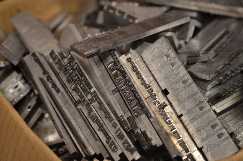 While we chat, the Typograph machine is whirring into action. After an alloy of tin, lead and antimony is heated in a crucible, the lid is closed and a form holding the letter moulds slides into place. After some heavy clunks, a line of words cast into a metal block falls into a tray, ready for use. The process takes only a matter of seconds.
